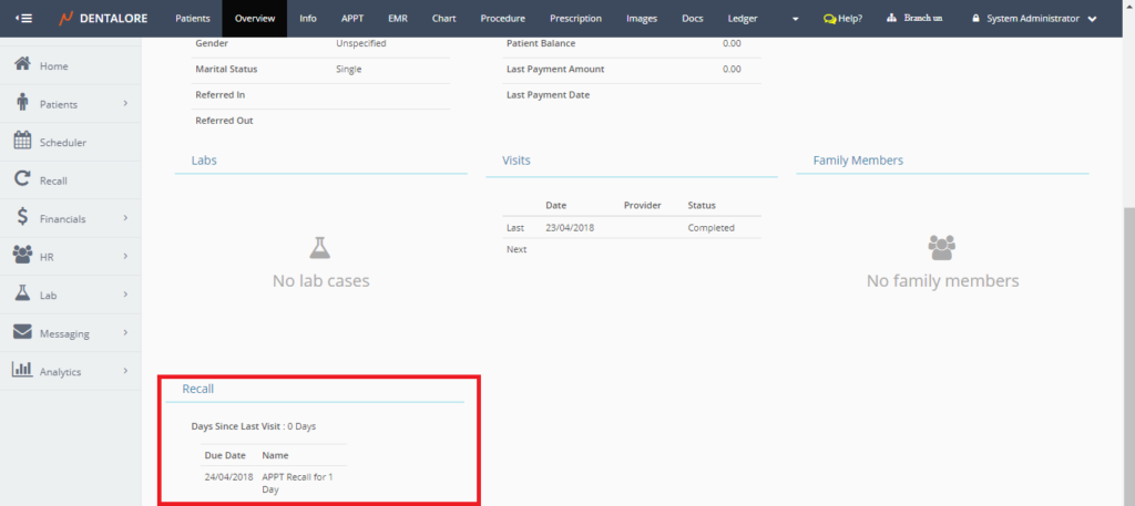 A new section “Recall” is added in the “Overview” page in patient’s module, that will display the upcoming 3 recalls of patient.