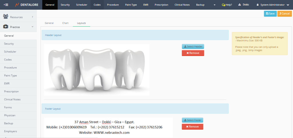 The size of the uploaded image could be managed from the “Templates” tab in Prescription, as well user could select if he want to display the header and footer or remove them.