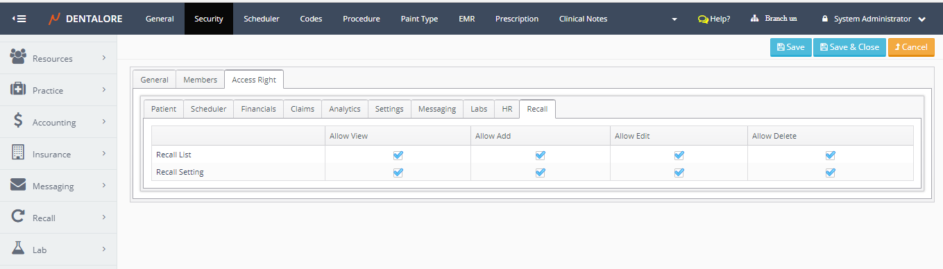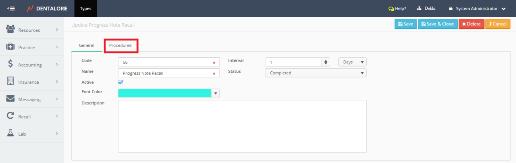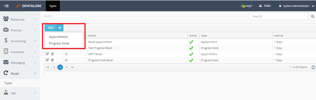 - Allow Add: Give the user the ability to add new recall type from settings module.