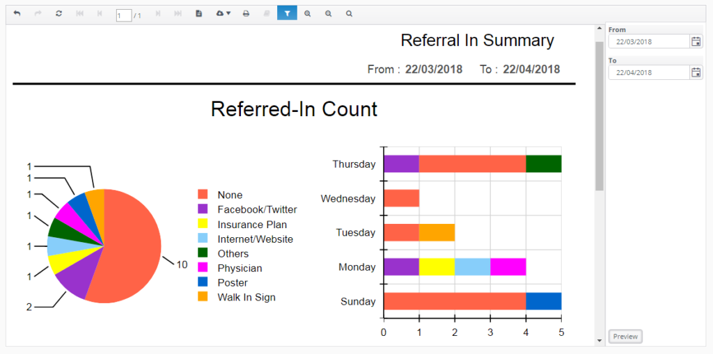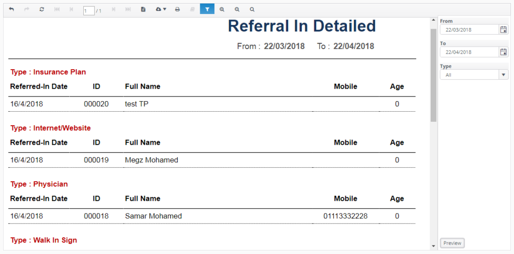 Referred In summary report enables user to preview and check sources of the referral in for all of his patients. This report is very helpful that it lets you know the number of new patients come to the clinic after a campaign done for example.