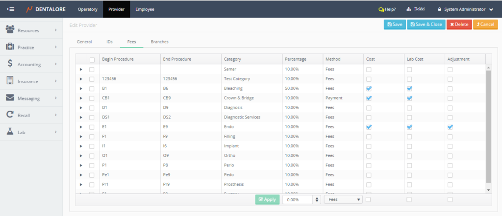 Clinic manager can calculate the provider’s fees based on either Procedure’s Fees or Actual Payment (enabled only in procedure ledger mode).