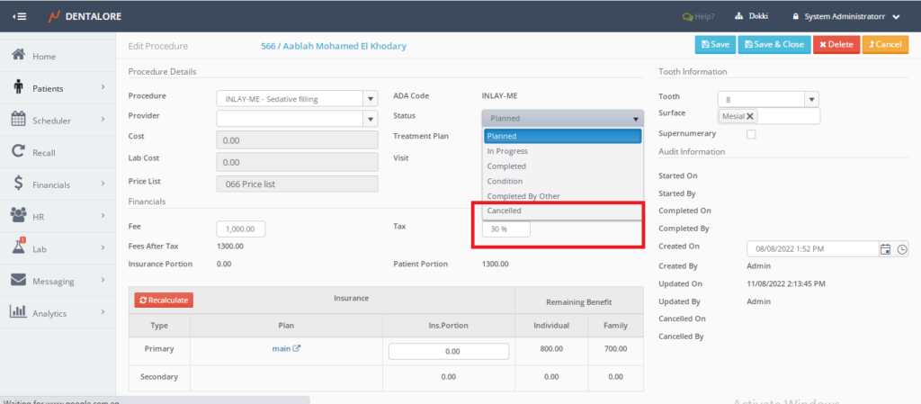 Now in Dentalore you can change the status of the procedure to be cancelled status from Edit procedure view