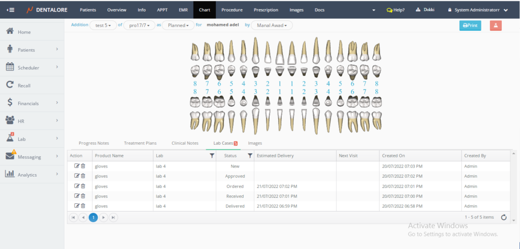 Now in Dentalore you can view all patient’s lab cases of all statuses (New, Approved, Ordered, Received and Delivered) from chart and also you can add new lab cases.