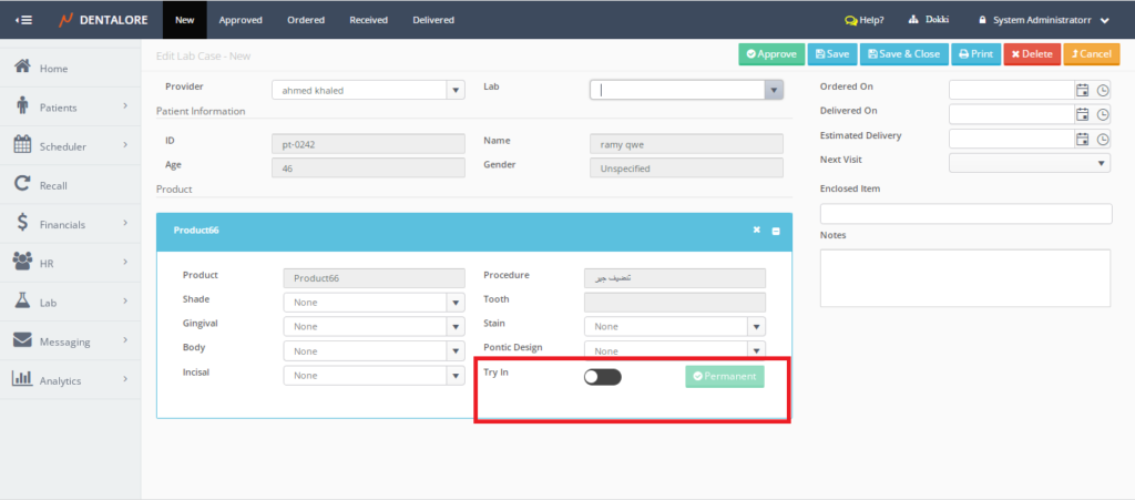 Lab Case support Try In and Permanent option