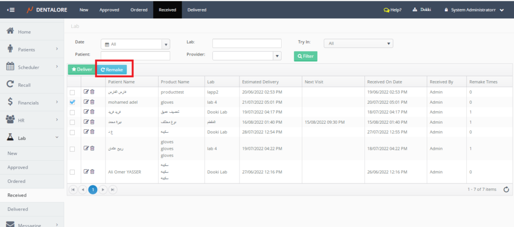 Location: Dentalore >> Labs >> Received /Delivered >> Remake button
