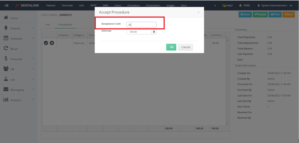 •  Dentalore >> Login > Claims tab >> Select Pre-Authorization Claim >> Click Edit >> Click Send >> Procedures Tab >> Click Approve >> Accept Procedure Popup