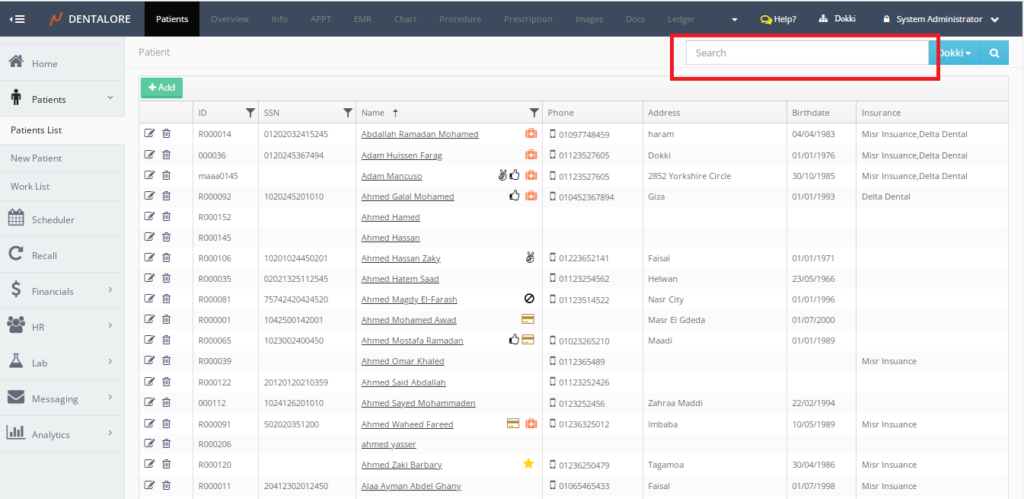 • Dentalore Home >> Patient List >> Search.