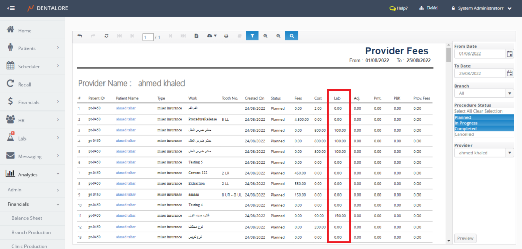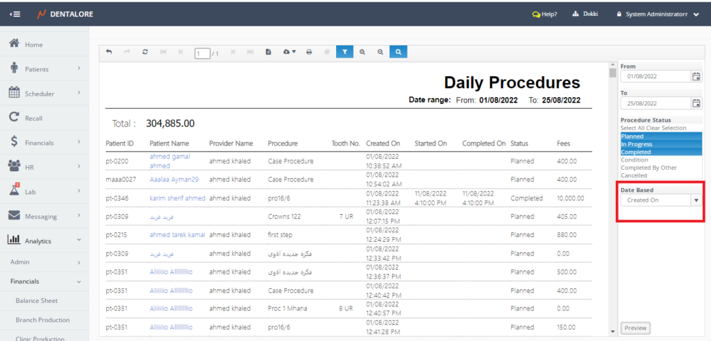 Now in dentalore you can filter with filter procedures according to provider preferred branch in provider procedure report