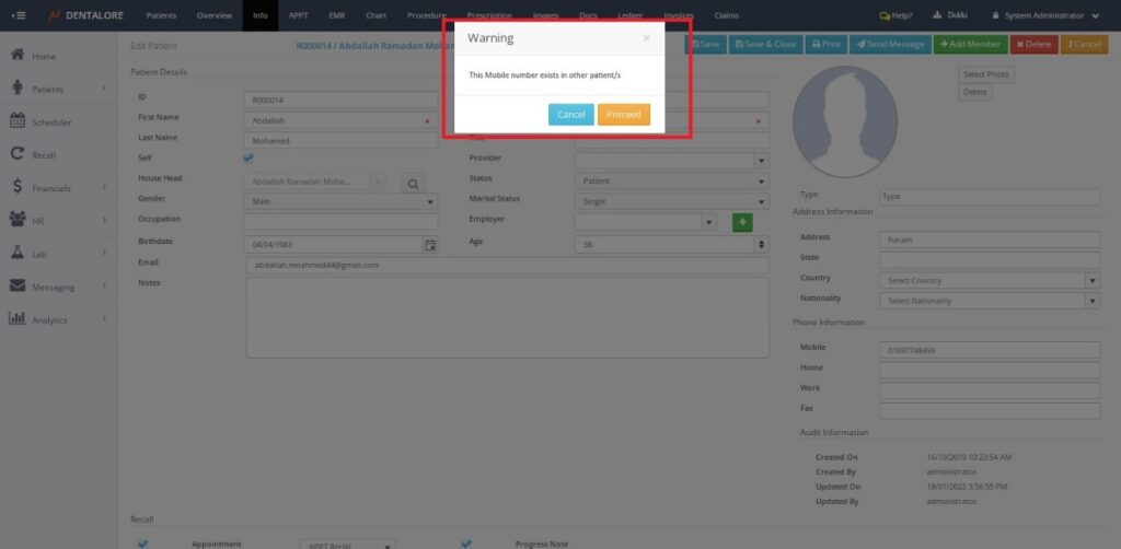 When add/change patient's mobile number Dentalore check if the entered mobile number exist or not, and display warning message when patient's mobile number duplication happens.