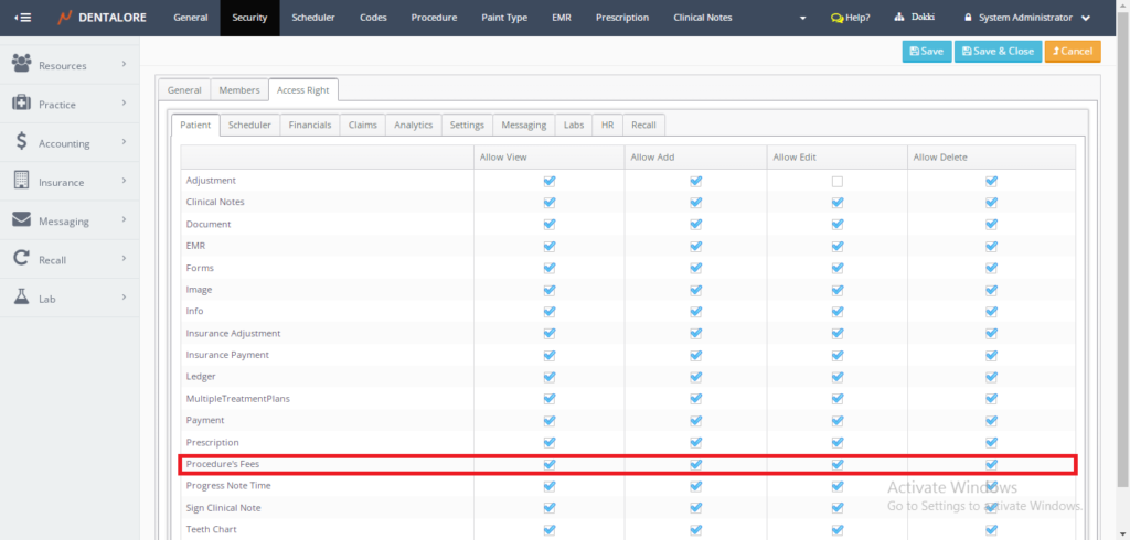 Now In patient overview you can show/hide patient ledger section according to (Procedure’s Fees) Access Right