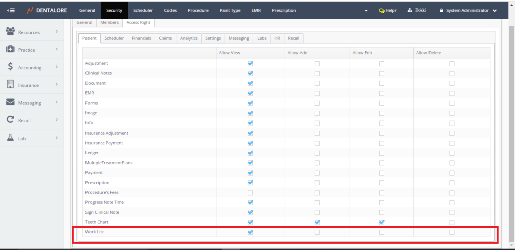 Access rights location: Settings >> DentaLore Home -> Settings -> Practice -> Security -> Select any Group -> Click Edit -> Access Right Tab -> Patient Tab