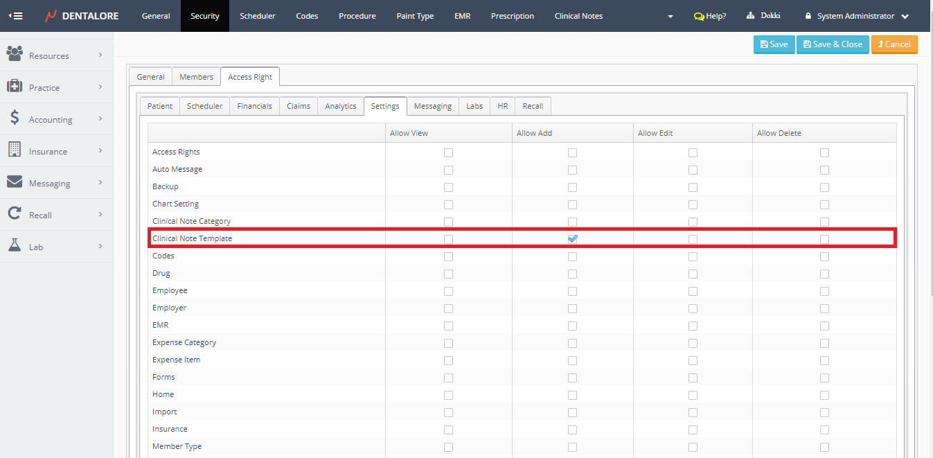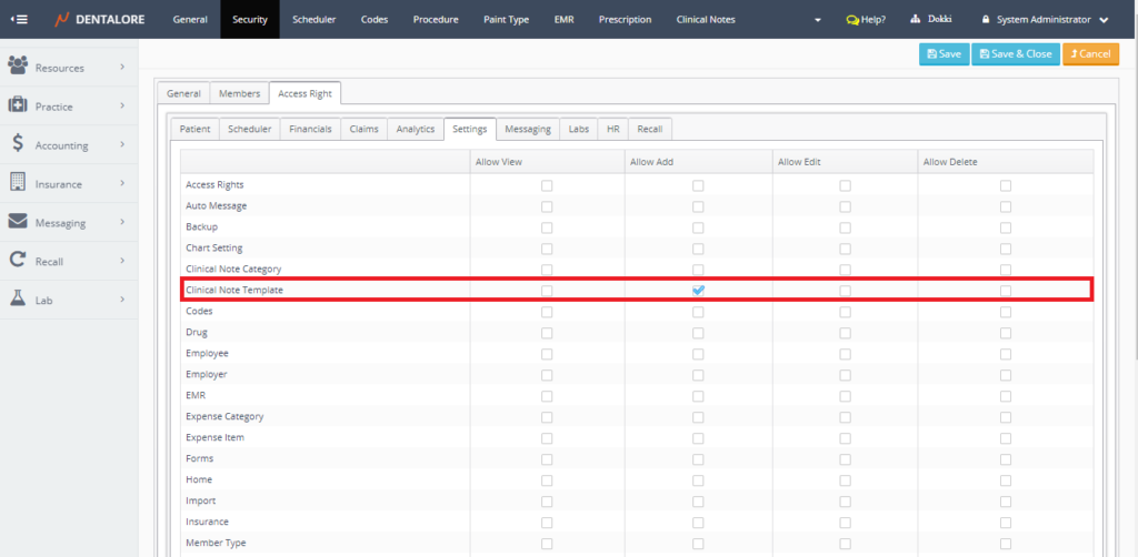 Note that: User (Provider) must be allowed (given access) of “Allow Add” to the feature of (Add Clinical Note Template) from the Access Rights tab in security module, in order to be able to save a clinical note template from the “Add Clinical Note” popup.