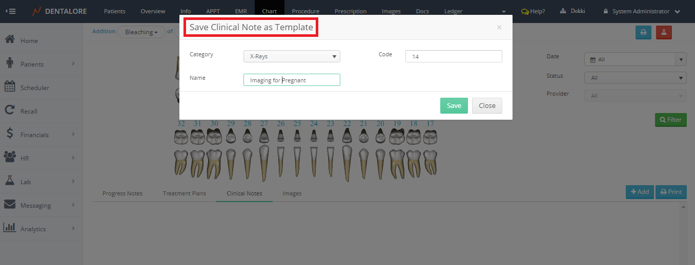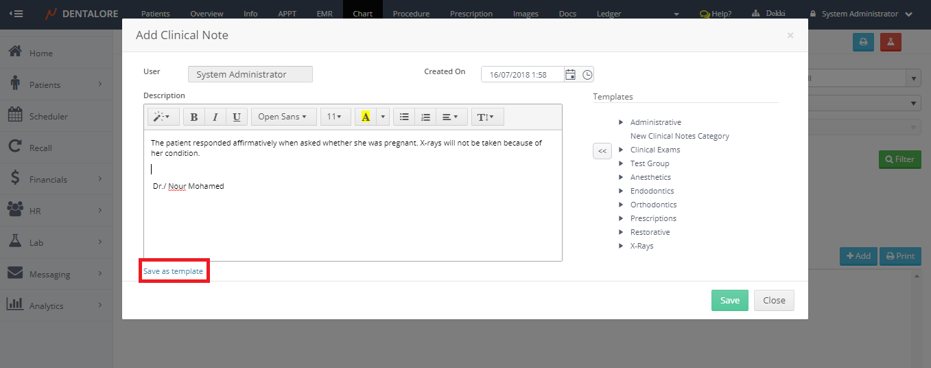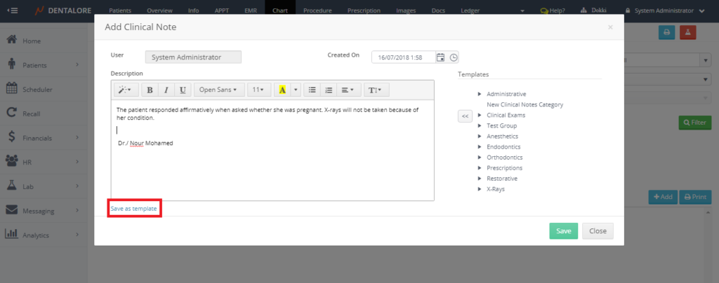 Dentalore system offers the provider to add unlimited number of clinical notes for his patients using predefined templates or customized templates created by him.