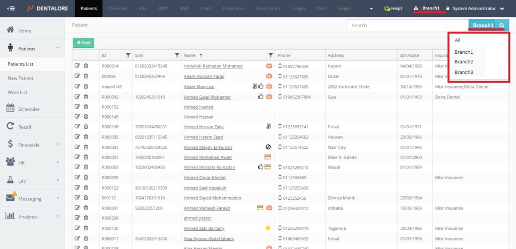 • Branch Selection: Is a drop down menu that includes the existing defined active branches for your clinic to allow user to search in a specific branch or in all branches. Default selection of the "Branch" drop down menu is the branch displayed in the navigation bar.