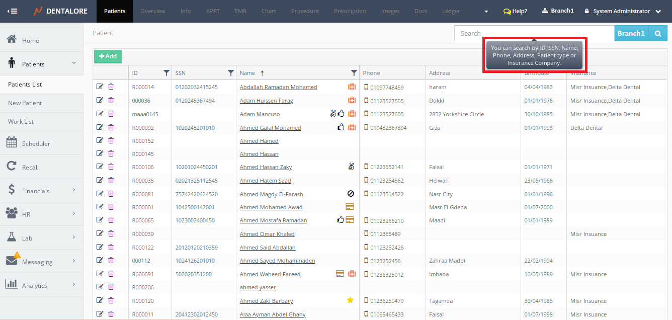 • Search field: Once the user hover over the search field, a message displayed informing the user that he could search using: ID, SSN, Name, Phone, Address, Patient Type or Insurance Company.
