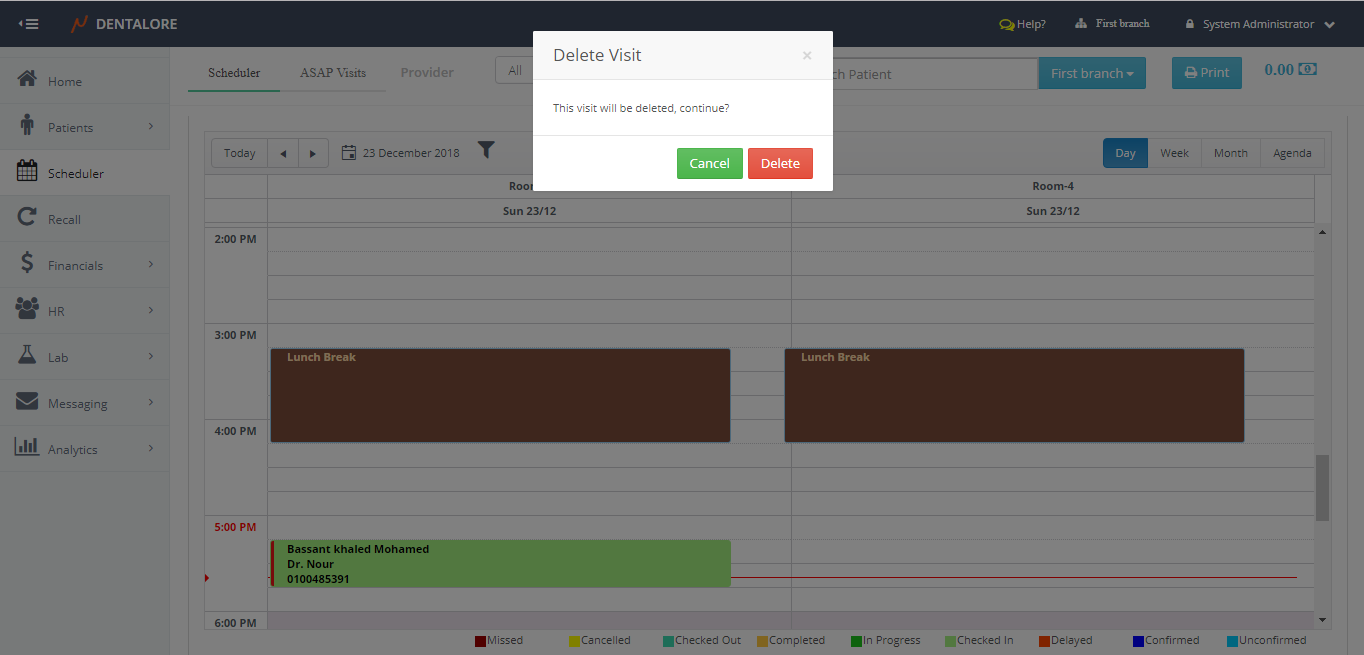 - When (Delete) is selected, Popup opens to let user confirm or cancel the deletion of the visit.