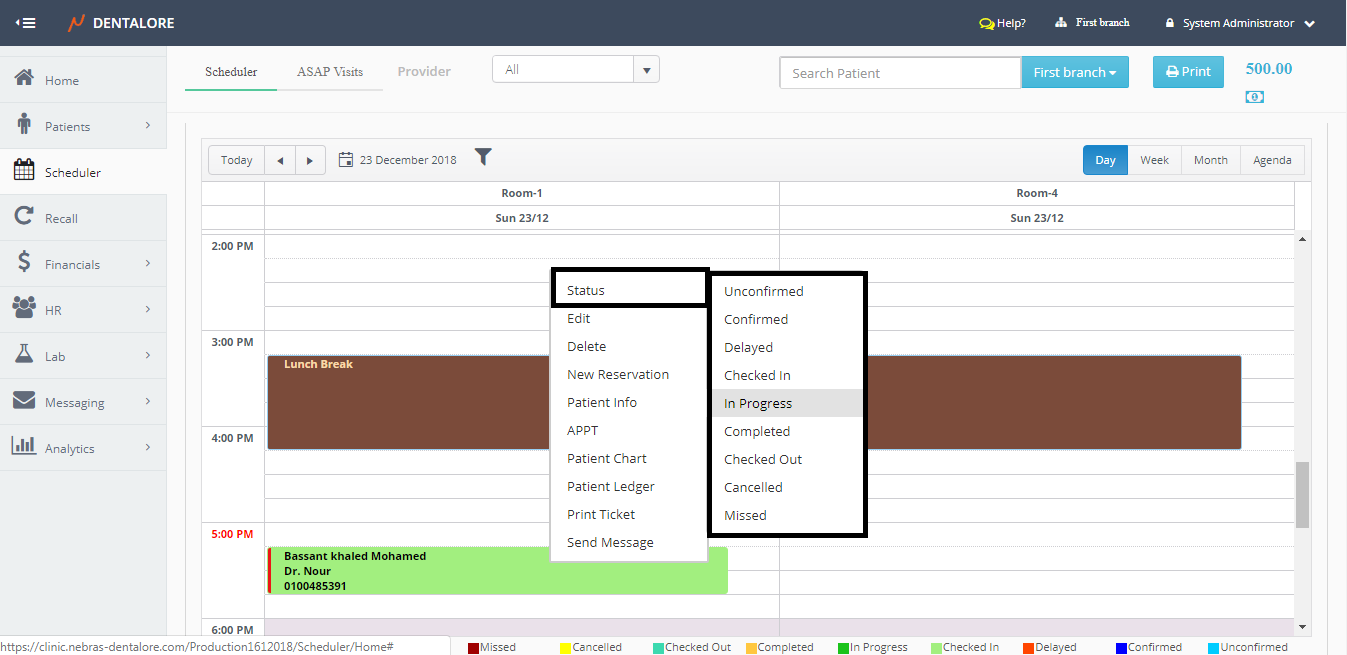 - When (Status) is selected, New menu opens that contains all the visit's statuses in order to select new status for the visit directly from the scheduler view, without the need to open the "Edit Visit" page.