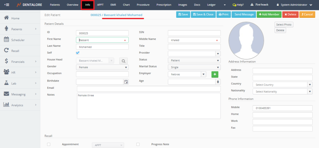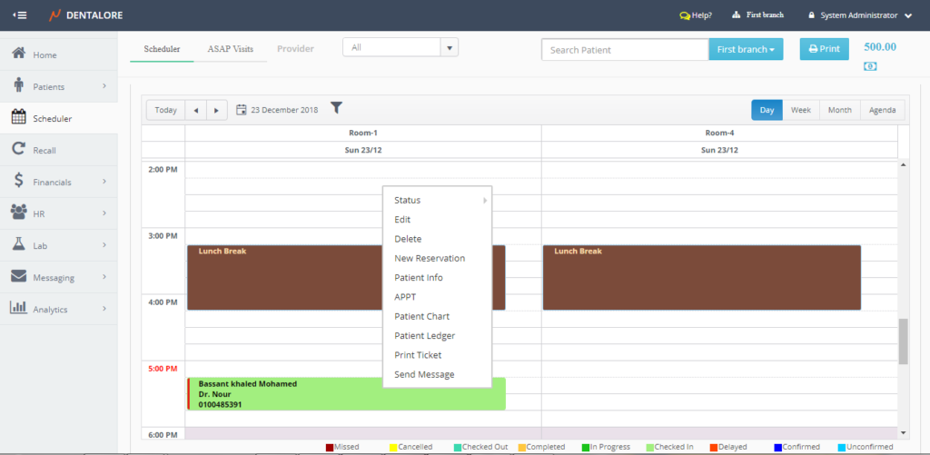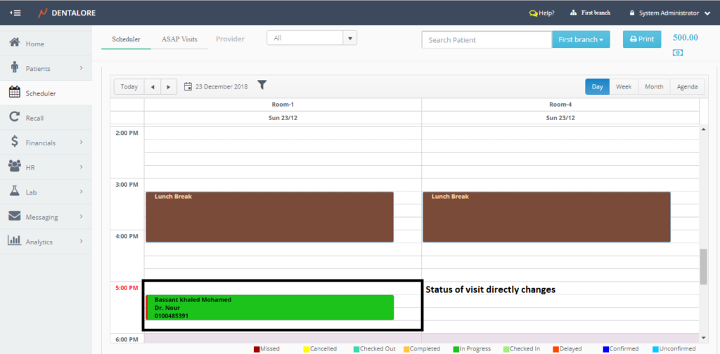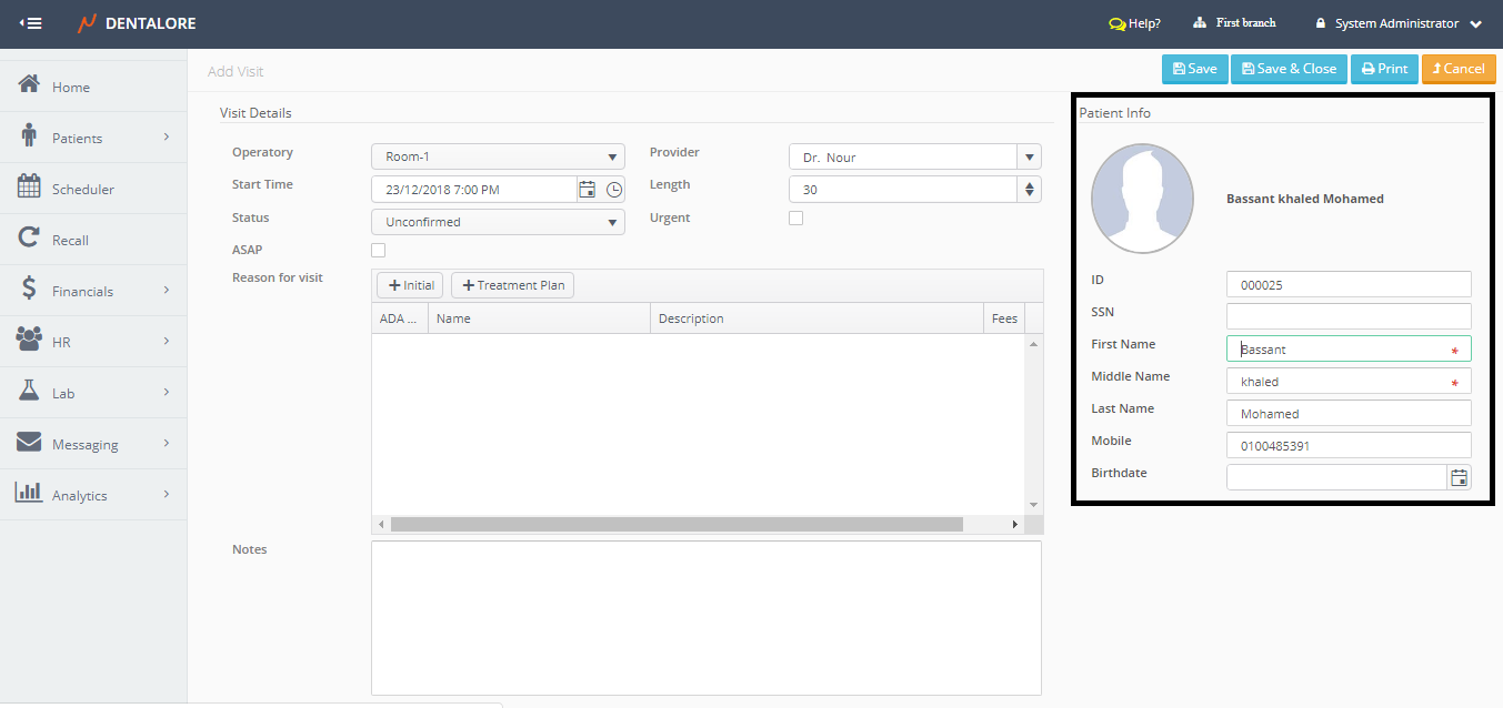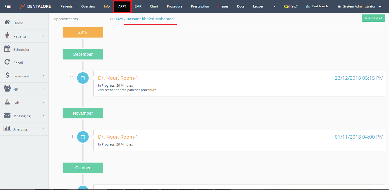 - This option used to add a new visit (Appointment) for the patient. When selected user directed to the "Add Visit" page with the patient's data displayed in it.