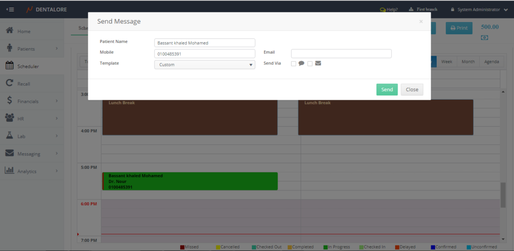 - This option enables user to send manual message (SMS and/or Email) to the patient. When pressed, a Popup "Send Message" opens.