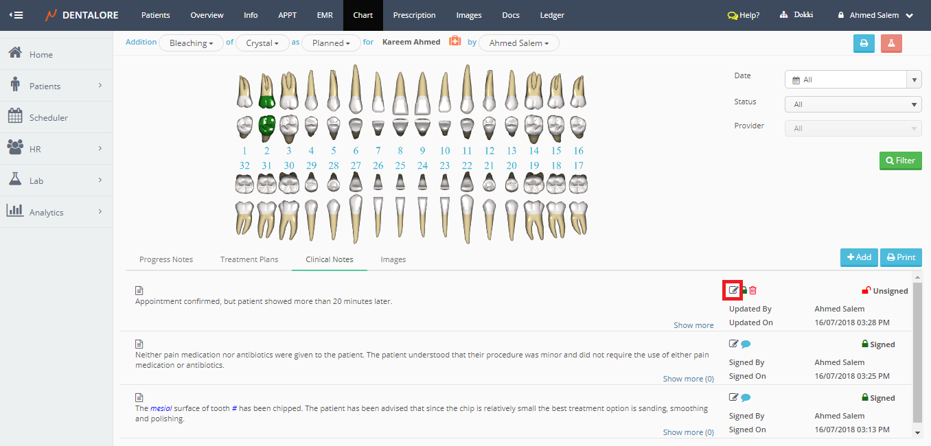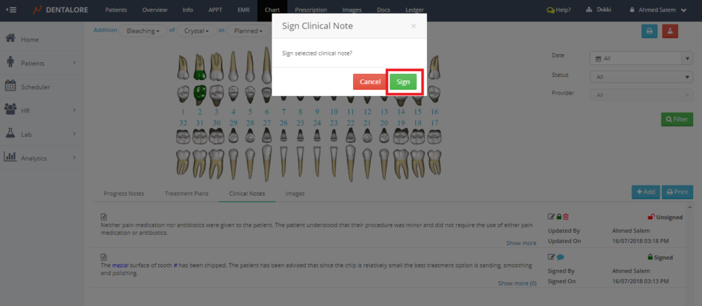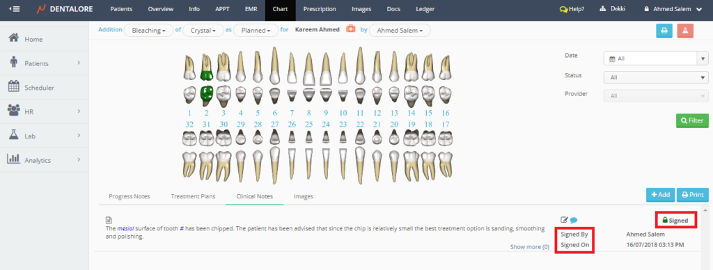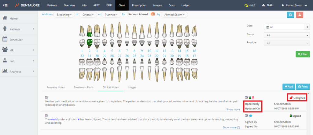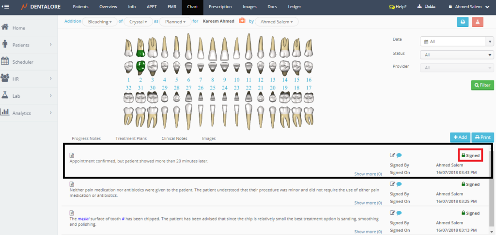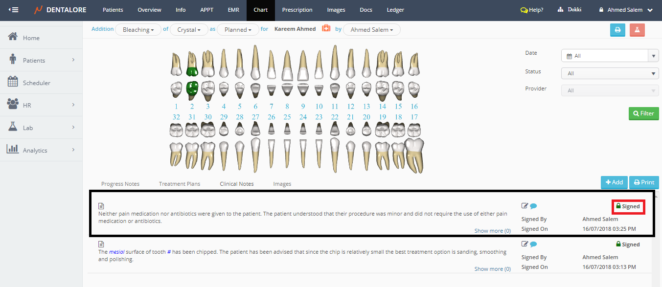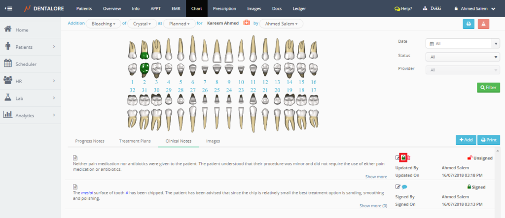 In Dentalore system, the clinical notes have one of the two status, either to be signed or to be unsigned.