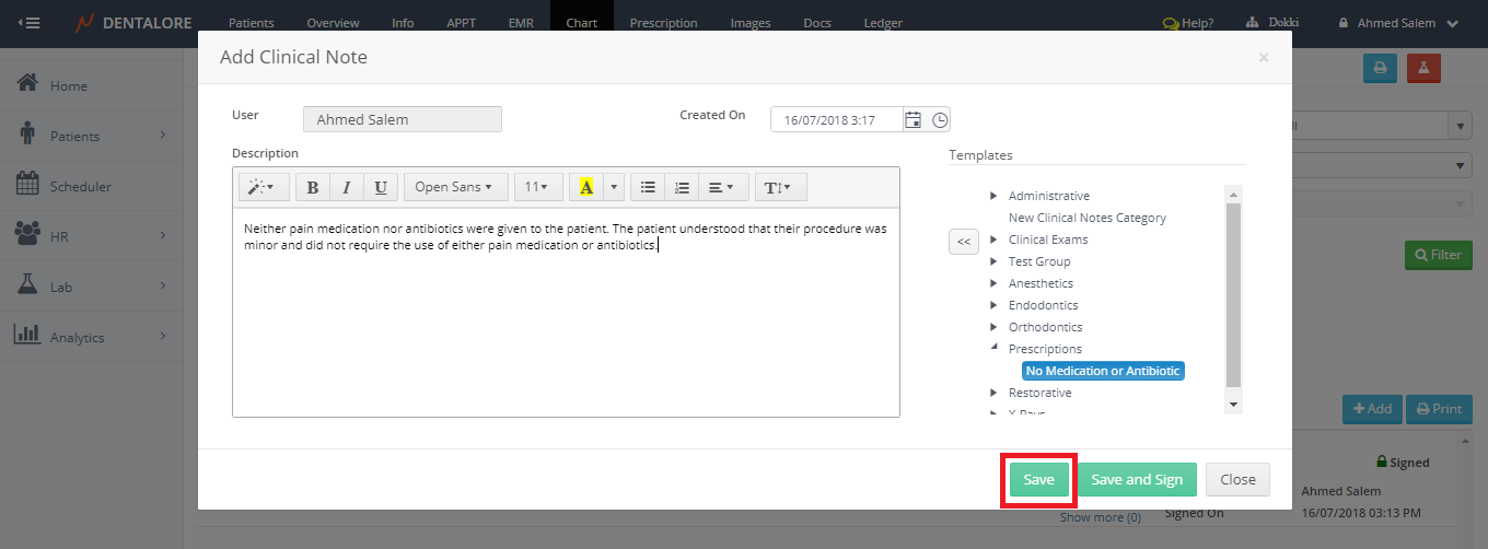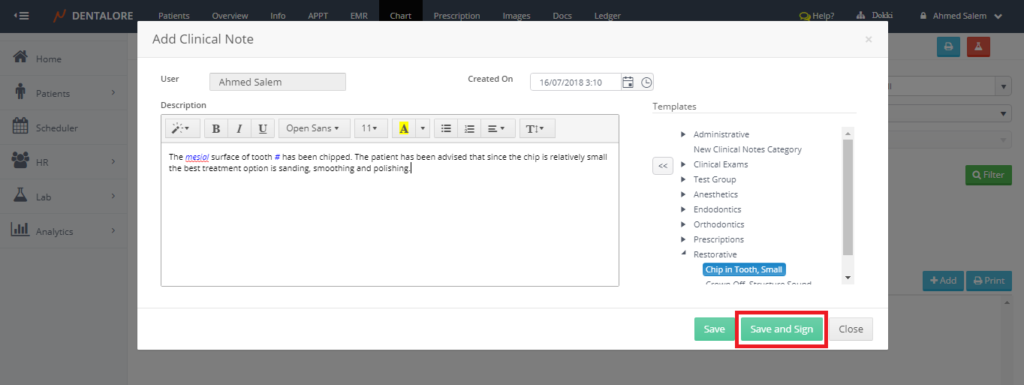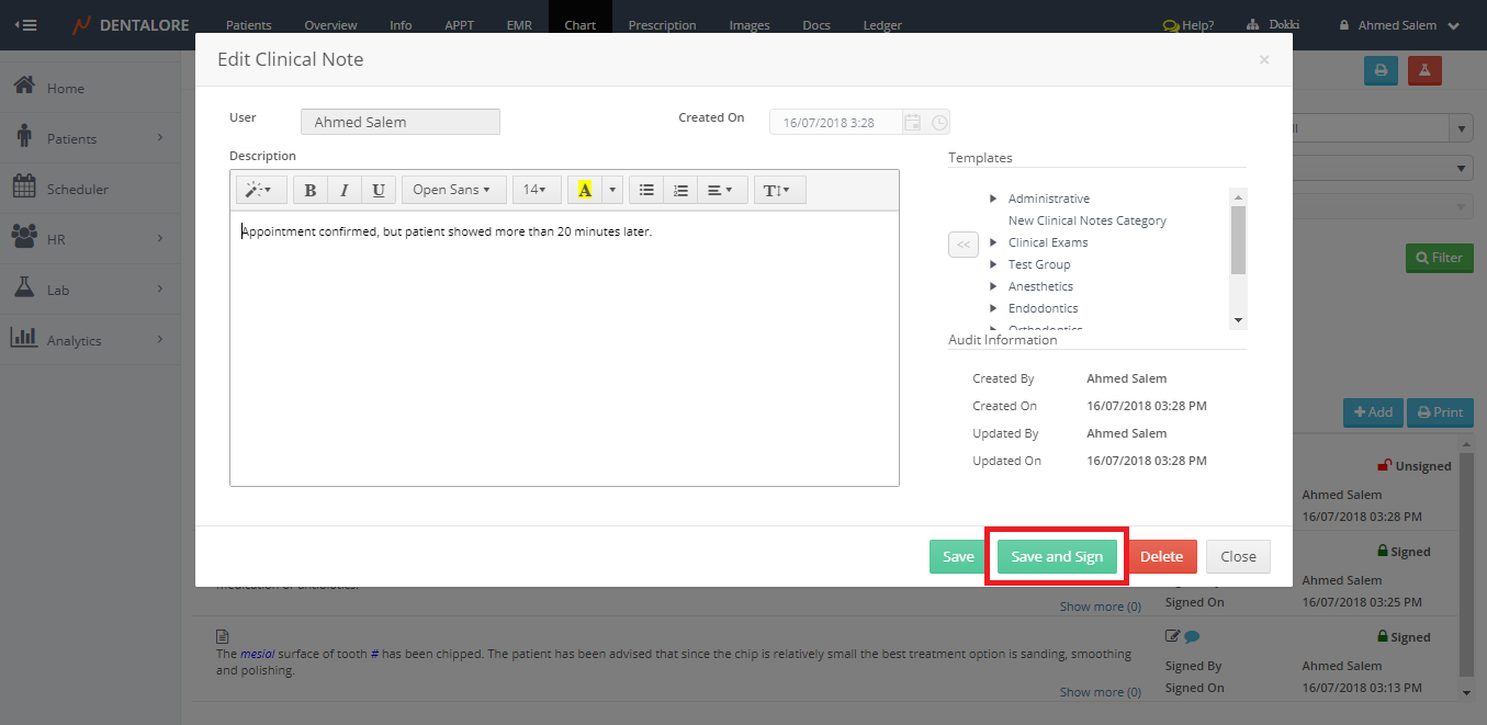 Note that: From the “Edit Clinical Note” Popup, the user could edit any field in the clinical note’s body, as well he/she could delete the clinical note. - Press “Save and Sign“, then the clinical note will be signed.