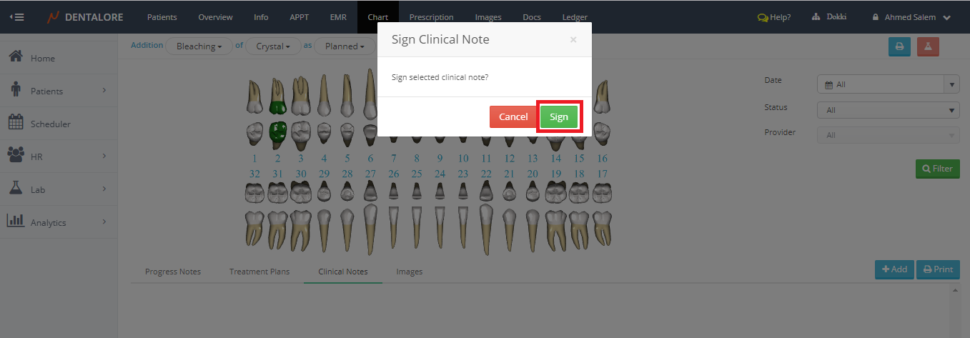 - Popup “Sign Clinical Note” opens, that contains 2 buttons (Cancel) and (Sign)
