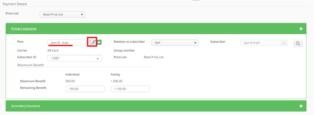 - Open the “Insurance” section, where the plan is defined for the patient in the “Payment Details” section exits in the patient’s Info module.