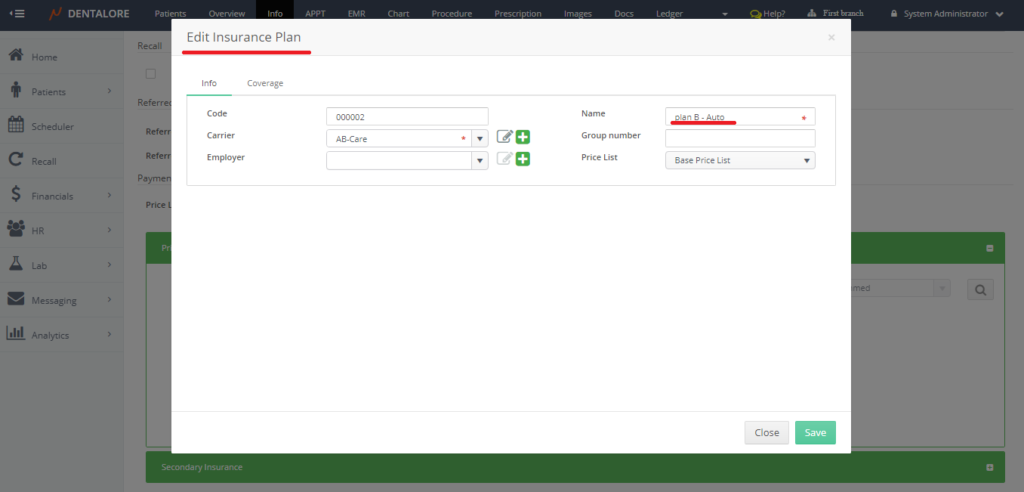 - New Popup “Edit Insurance Plan” opens where the user could edit the required fields either in the (Info) tab or (Coverage) tab.