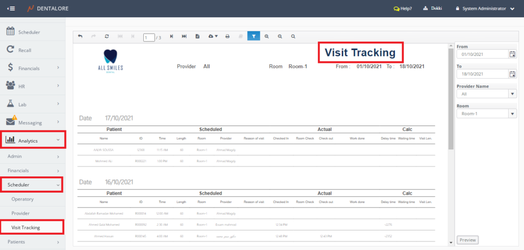 - Displays detailed information about the patients’ visits in the selected branch within specific date range.